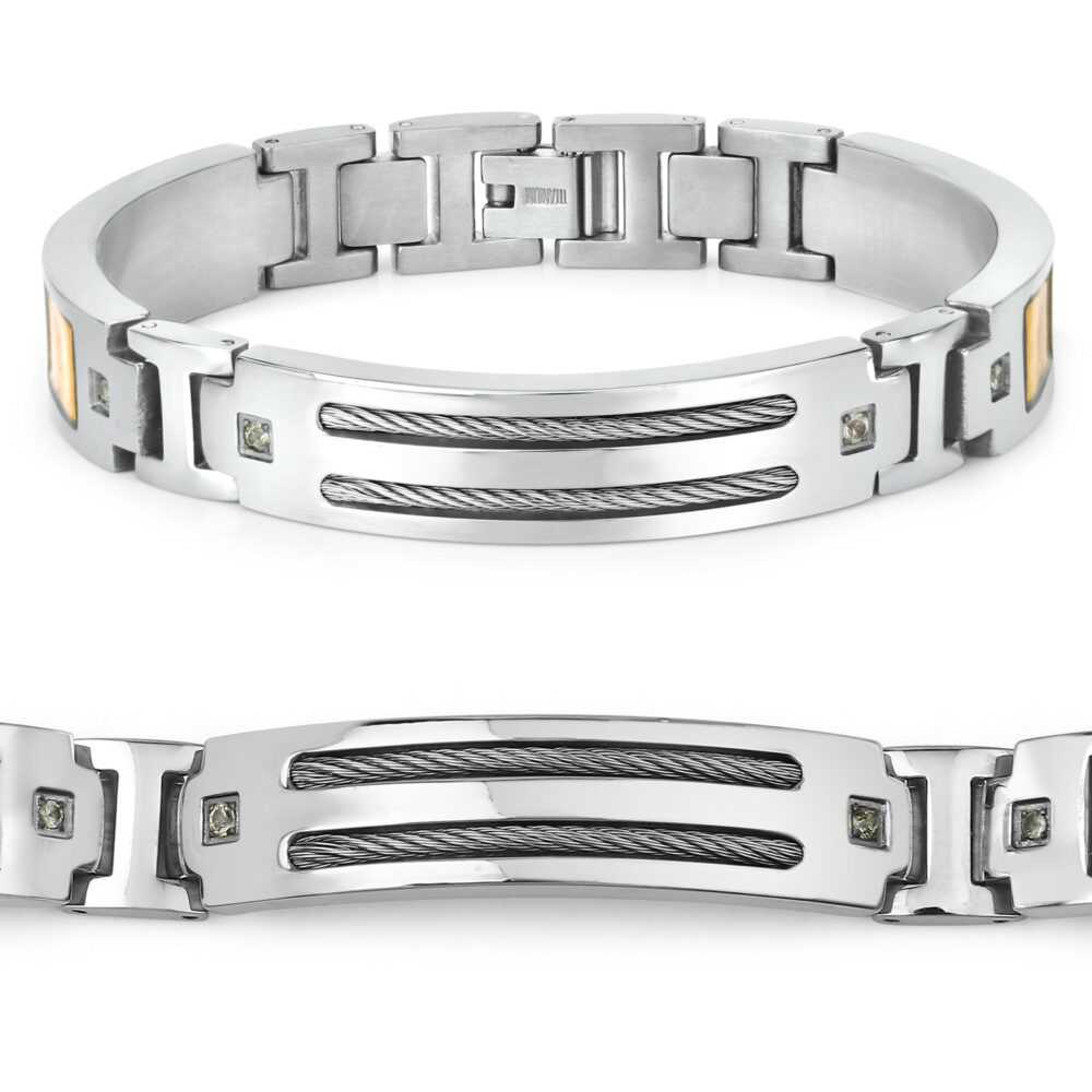 This Titanium Men’s Bracelet, Mens Titanium Bracelet with Gold Plated Steel Inlay, 0.48ctw. Natural Green Sapphire Rounds is a Bracelets that is made out of Titanium