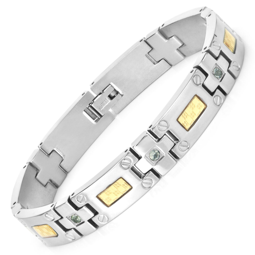 This Titanium Men’s Bracelet, Mens Titanium Bracelet with Gold Plated Steel Inlay, 0.56ctw. Natural Green Sapphire Rounds is a Bracelets that is made out of Titanium